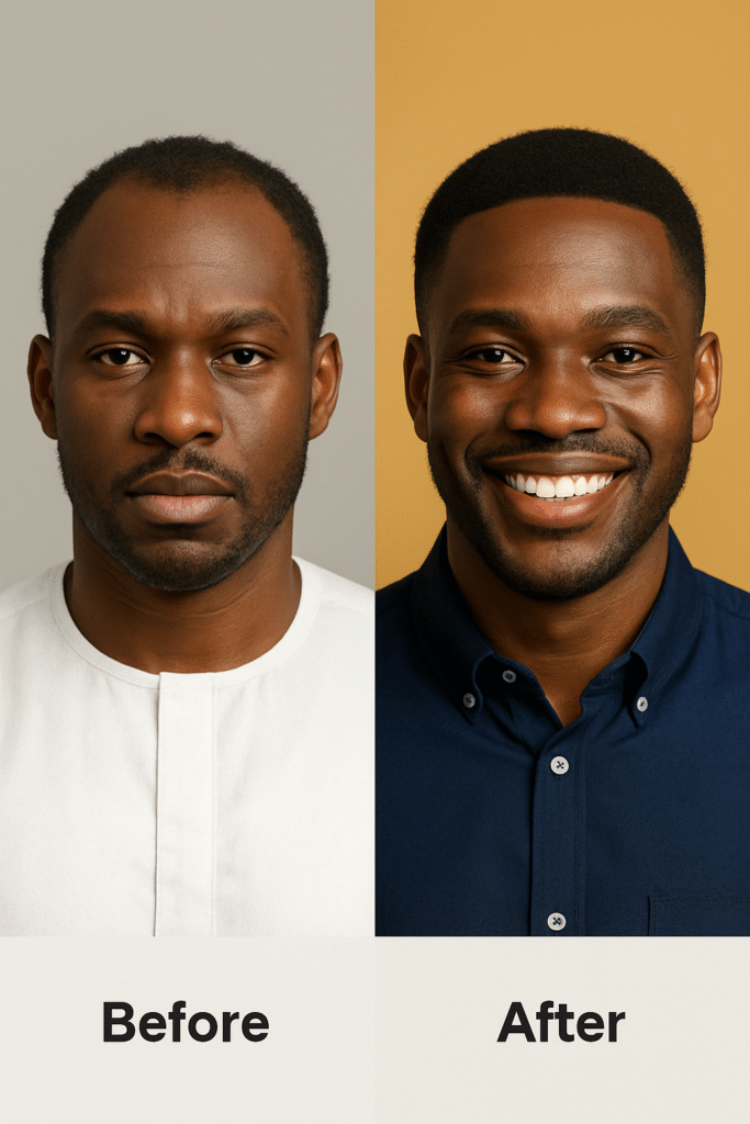 "I had a receding hairline that made me so self-conscious. Two months in, and it’s filling in better than I ever expected." — Joseph, Port Harcourt